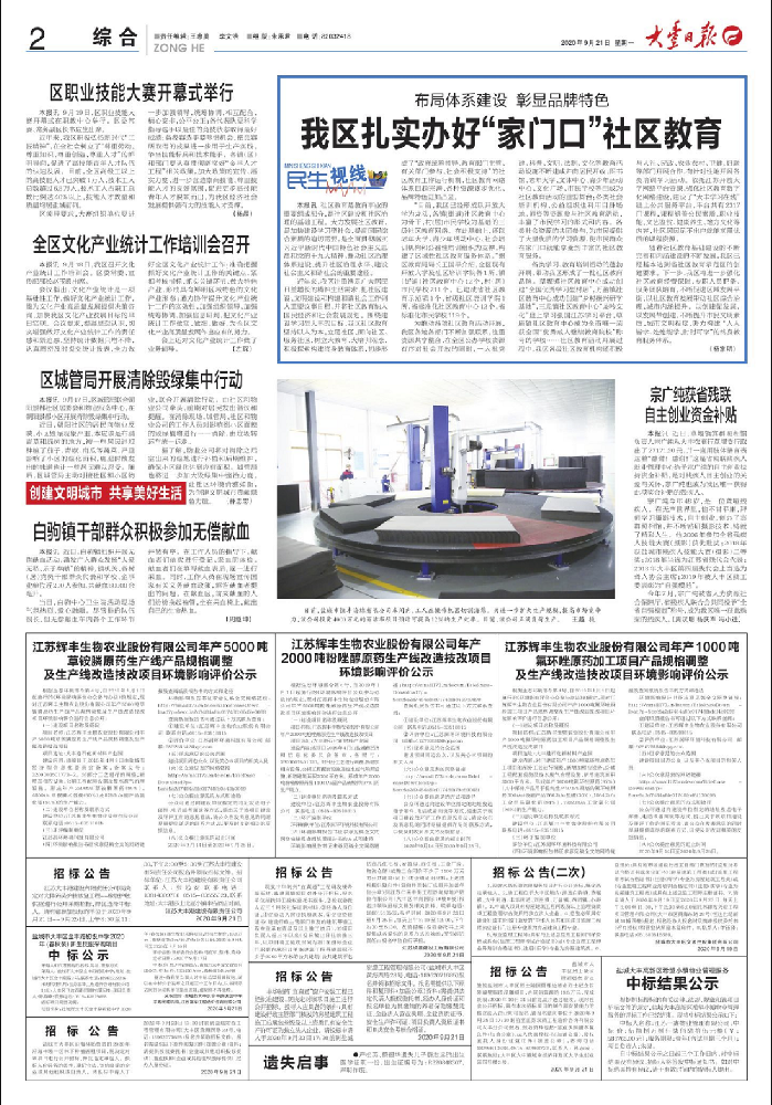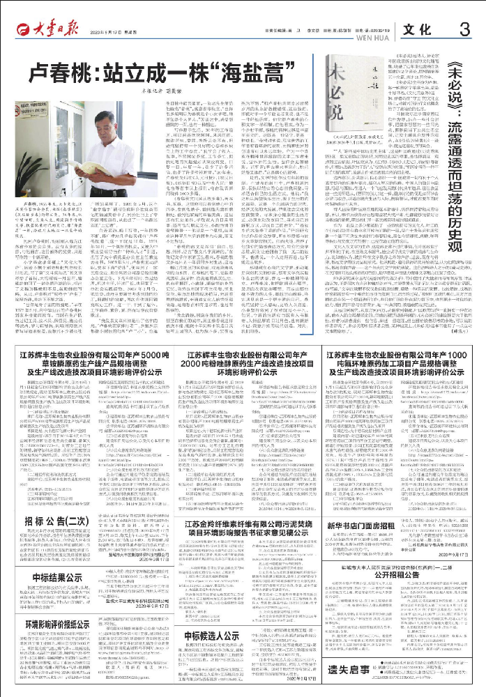 在項(xiàng)目環(huán)評(píng)征求意見稿公示同期,我公司分別于2020年9月17日及2020年9月21日在《大豐日?qǐng)?bào)》上刊登了項(xiàng)目環(huán)境影響評(píng)價(jià)公開信息,見圖3.2-2和圖3.2-3。