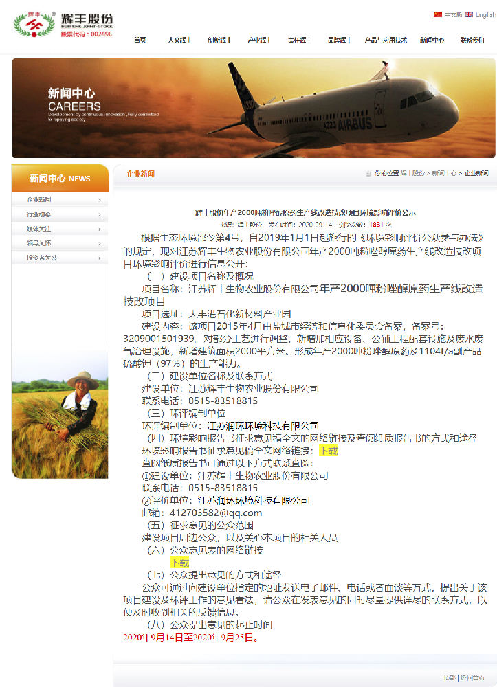 江蘇輝豐生物農(nóng)業(yè)股份有限公司年產(chǎn)2000噸粉唑醇原藥生產(chǎn)線改造技改項(xiàng)目環(huán)境影響報(bào)告書按照《環(huán)境影響評(píng)價(jià)公眾參與辦法》(生態(tài)環(huán)境部部令 第4號(hào))要求進(jìn)行公眾參與,具體為;2020年9月14日~2020年9月25日在輝豐公司網(wǎng)站上向相關(guān)公眾對(duì)項(xiàng)目情況、環(huán)評(píng)情況進(jìn)行了征求意見稿公示。網(wǎng)站鏈接地址為:http://www.centregarden.com.cn/index.php?a=article&aid=1112,公示期10個(gè)工作日。