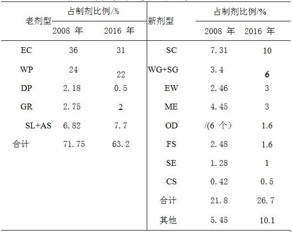 表2:2008、2016年中國登記的農(nóng)藥制劑產(chǎn)品主要劑型分布(按登記產(chǎn)品統(tǒng)計)